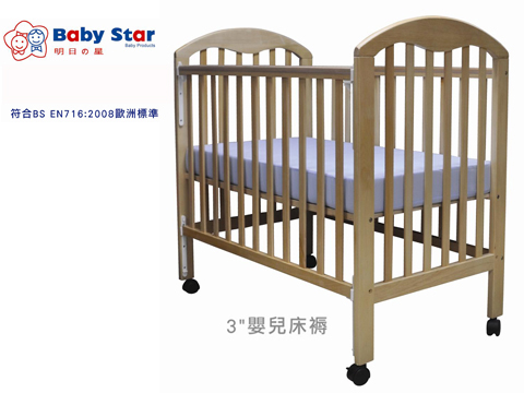 BABY STAR 三段嬰兒木床- 外圍: 63.5(W) x 106(L) x 101.5(H) cm- 內圍: 58(W) x 101.5(L) cm - 連3吋海棉床褥- 底板設有三段高度可供調節 - 床板與地面高度: 55cm / 41.5cm/ 26cm- 單邊升降欄- 加有防咬膠邊,確保使用安全- 符合 BS EN716:2008 歐洲標準- 備有白色或原木色可供選購