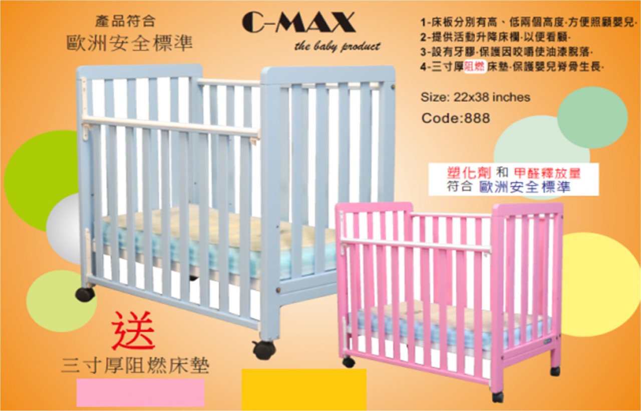 C-MAX嬰兒木床 (888-W)- 22"(W) x 38"(L)- 送3"厚橺棉海棉床褥- 底板設有兩個高度可供調節 - 單邊升降欄- 加有防咬膠邊,確保使用安全 - 顏色:白色/ 粉紅色/ 粉藍色