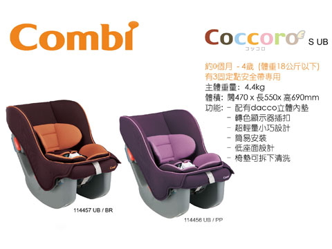 COMBI汽車安全座椅(Coccoro S UB)- 0月 ~ 4歲- 18公斤以下嬰兒使用- 體積: 闊420x長635x高540mm- 重量: 4.4kg- 有3固定點安全帶專用- 功能:- 配有 「dacco」立體內墊- 採用透氣布料- 轉色顯示器插扣- 低座面設計- 防止滑動設計,穩固安裝在汽車上- 椅墊可拆下清洗本產品只供訂購,店內不設陳列及存貨註:附圖僅供參考,一切以實物為準