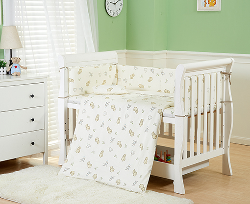 California Bear斜紋布嬰兒床品套裝 - (得意小熊)- Model: CB11028- 套裝包括: - 被連芯(35"x 50")- 枕頭(8" x 12")- 枕袋(8" x 12")- 床笠(28" x 52" x 7.5")- 2 x 床圍(10" x75") - 優質100% 全棉斜紋布製造, 手感柔軟, 被芯及枕芯可拆除- 約770針/10cm²