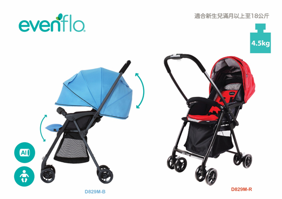 Evenflo 超輕量雙向手推車- 輕量設計4.5kg - 適合新生兒滿月以上至18kg - 雙向推把設計 - 簡易單手收摺 - 可拆洗式椅墊 - 天窗設計 - 前輪避震 - 腳套保護 - 原廠代理提供一年保養