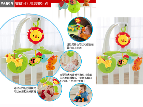 FISHER-PRICE 可拆式音樂吊鈴- 可拆式音樂吊鈴- 此款吊鈴有四種模式可以安撫和娛樂寶寶- 音樂可撥放15分鐘並且有兩種模式,- 安撫搖籃曲和心跳/子宮裡的聲音。- 這款吊鈴也可以方便的在嬰兒車上使用。- 當寶寶的年紀以不再用吊鈴時,- 還可以將吊鈴架拆下,- 留下上面的動物做為玩具。- 產品尺寸(包裝):29*8.5*33cm- 音樂部份由電池操作/ 旋轉部份由手動上鏈操作註:附圖僅供參考,一切以實物為準